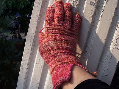Well, first there is destashing. (And one of this long weekend's activities is to go through the stash, see what I'm ready to part with and put it up on my sale page over on Ravelry. Bookmark that page, peeps, there will some great stuff up there soon!) We've seen that sock yarn makes for some beautiful shawls as well (and I'll be showing off a few next time). And then there is the "new sock", gloves.